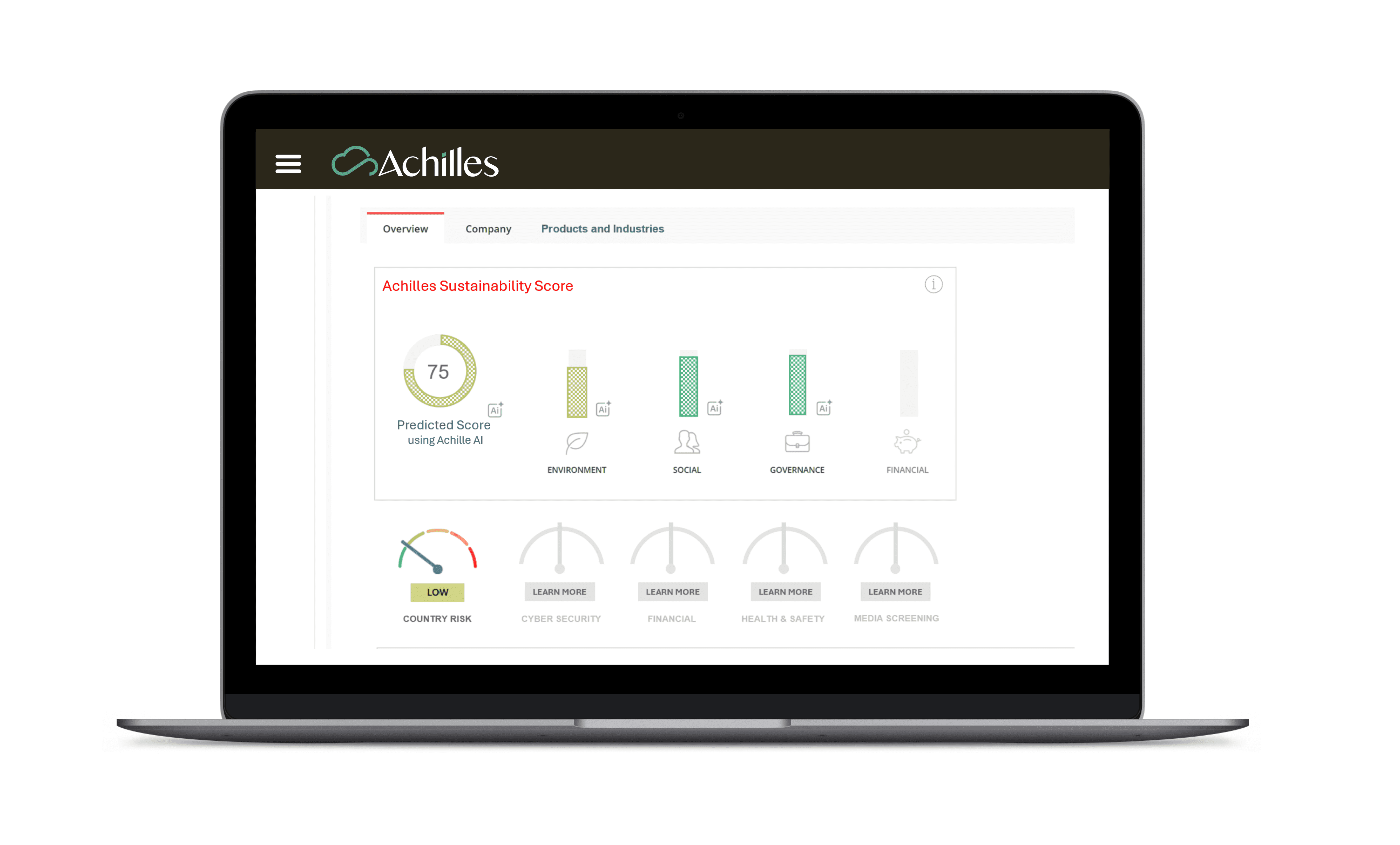 Powered by AchillesAI, Achilles Predictive Scoring offers a way to quickly understand ESG and country-level risks across your supply chain, with no supplier input needed. Whether you’re onboarding new vendors, mapping long-tail risk or preparing for a transaction, this service provides fast insight so you can focus your resources where they matter most.