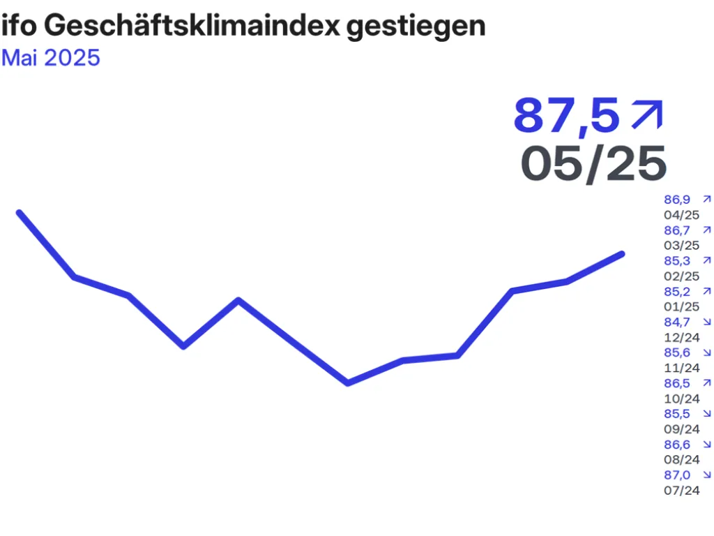 Fünf Monate in Folge: Der ifo-Geschäftsklimaindex klettert weiter – im Mai auf 87,5 Punkte. Besonders der Industriesektor zeigt Auftrieb, getrieben durch bessere Exporterwartungen, die von -9,4 auf -3,0 Punkte gestiegen sind. In Zahlen: Das ist die beste Exportstimmung seit über einem Jahr.