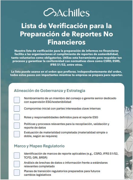 Navegar por los requisitos de los informes no financieros puede ser complejo, especialmente bajo marcos en evolución como la CSRD. Esta lista de verificación interactiva y completa de Achilles te ayuda a identificar los datos clave de la empresa, los procesos y los insumos de la cadena de suministro necesarios para realizar informes precisos, conformes y listos para auditoría.