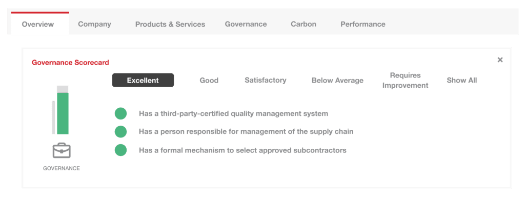 The new enhanced Achilles Sustainability Score uses even more data from Achilles extensive supplier data collection process, including carbon maturity data collected from the Achilles Carbon Management Module, to provides a more comprehensive view of ESG supply chain performance. The addition of the new Average Benchmark feature enables users to instantly see suppliers’ relative performance.