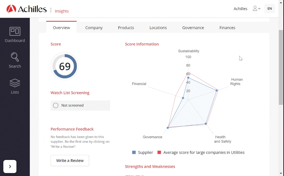 Access dashboards that show how suppliers score against our five pillarsof sustainability: financial, environmental, social, governance and health and safety.